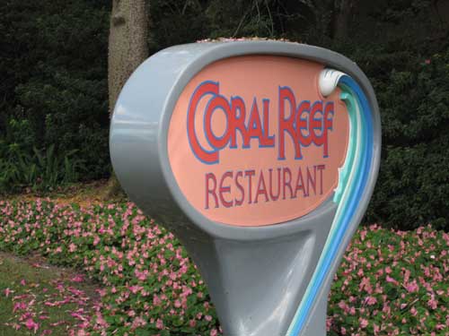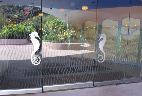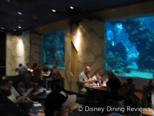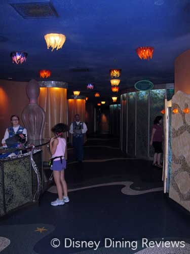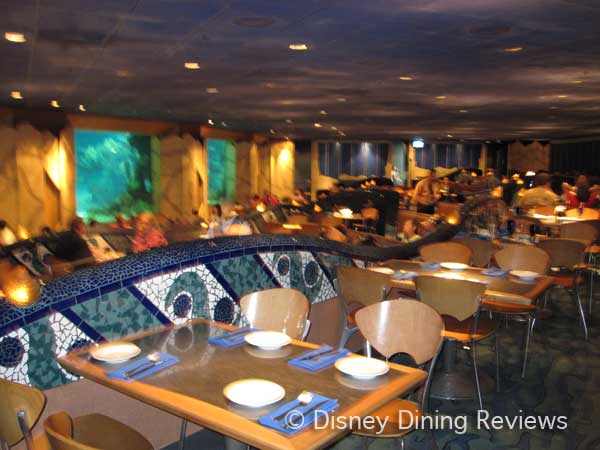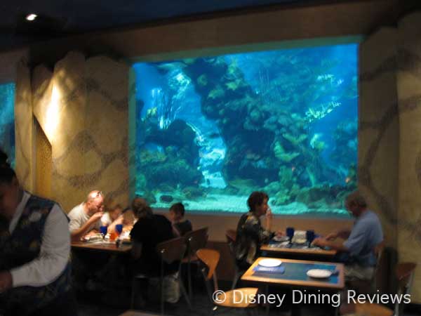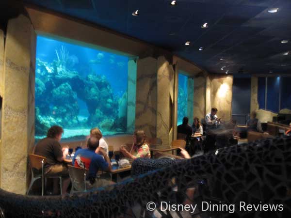 Upon entering this restaurant which is located on the right side of the Living Seas building which houses the aquariums along with the Crush show (which is a must see!) and the Little Mermaid ride, there are glass doors with heavy metal seahorse handles.