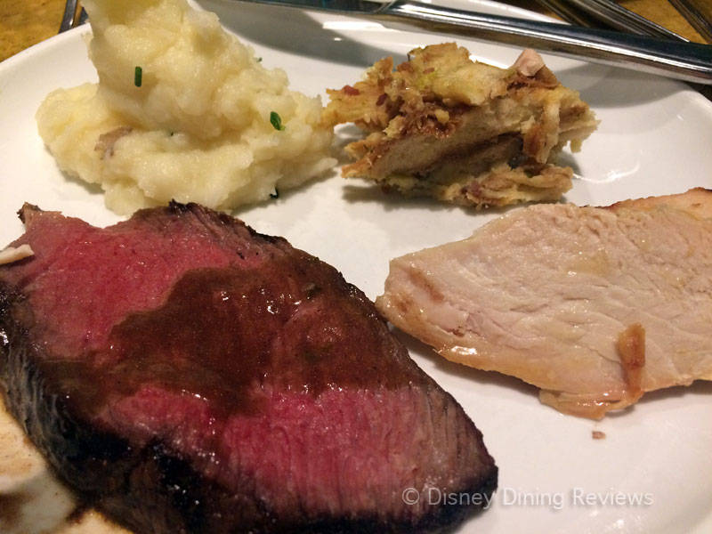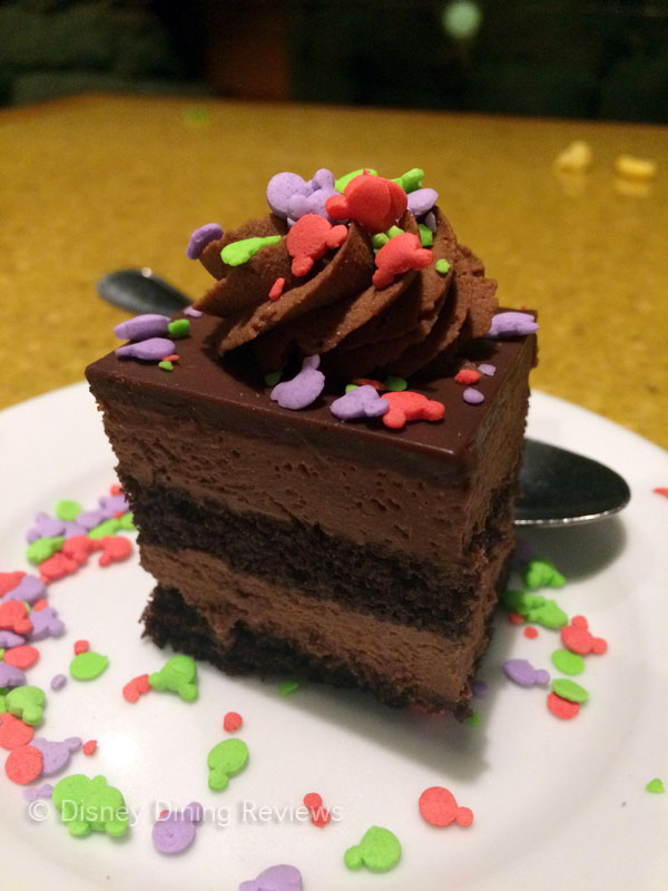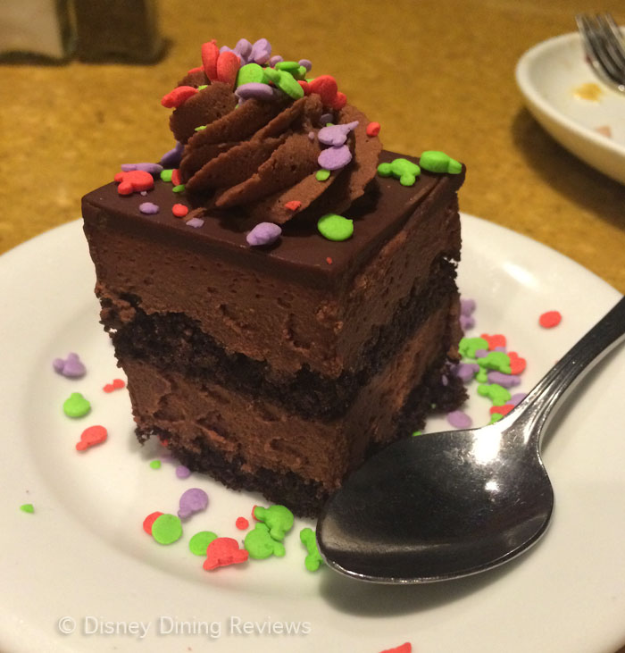 This was the first time we were ever displeased with this establishment and for the ever so sky-rocketing pricing even at lunch, it is not calling us to come back anytime soon I’m afraid. It did at least end on a nice note. We are chocoholics and the server was kind enough to bring some of their “celebration” desserts rather than the strawberry thingy they normally have. That was a nice piece of chocolate mousse cake topped with festive Mickey Mouse sprinkles, now that I enjoyed but salad, potatoes, mac n cheese and chocolate cake for about $40 per person, I don’t think so. I think we may try breakfast next time around because we do love the characters and the interaction with them here, but looks like our lunch/dinner plans will be put on hold at least until the next menu change.