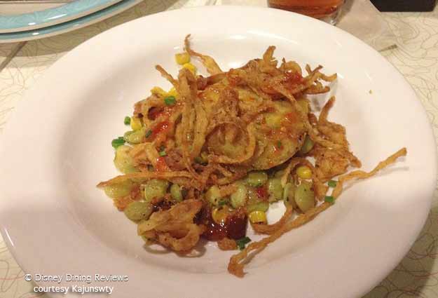 Now a side note…friends of ours were here just a few weeks before us so I am going to post a few extra photos so you can see what some of the other food items look like. I can’t really say how they tasted as I didn’t taste them but next time I may try this…Grandpa’s Crab Cake which is a lump crab cake served over edamame and corn succotash with bacon, chili sauce and crispy onions. (I also believe that these were the onion strings once served in place of those delicious onion rings we had).